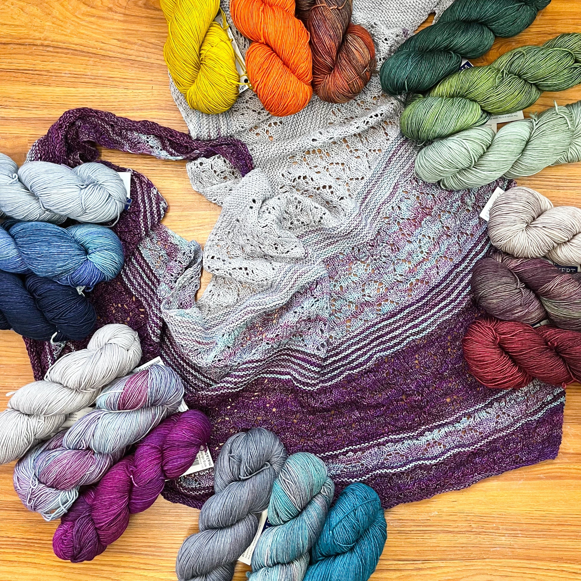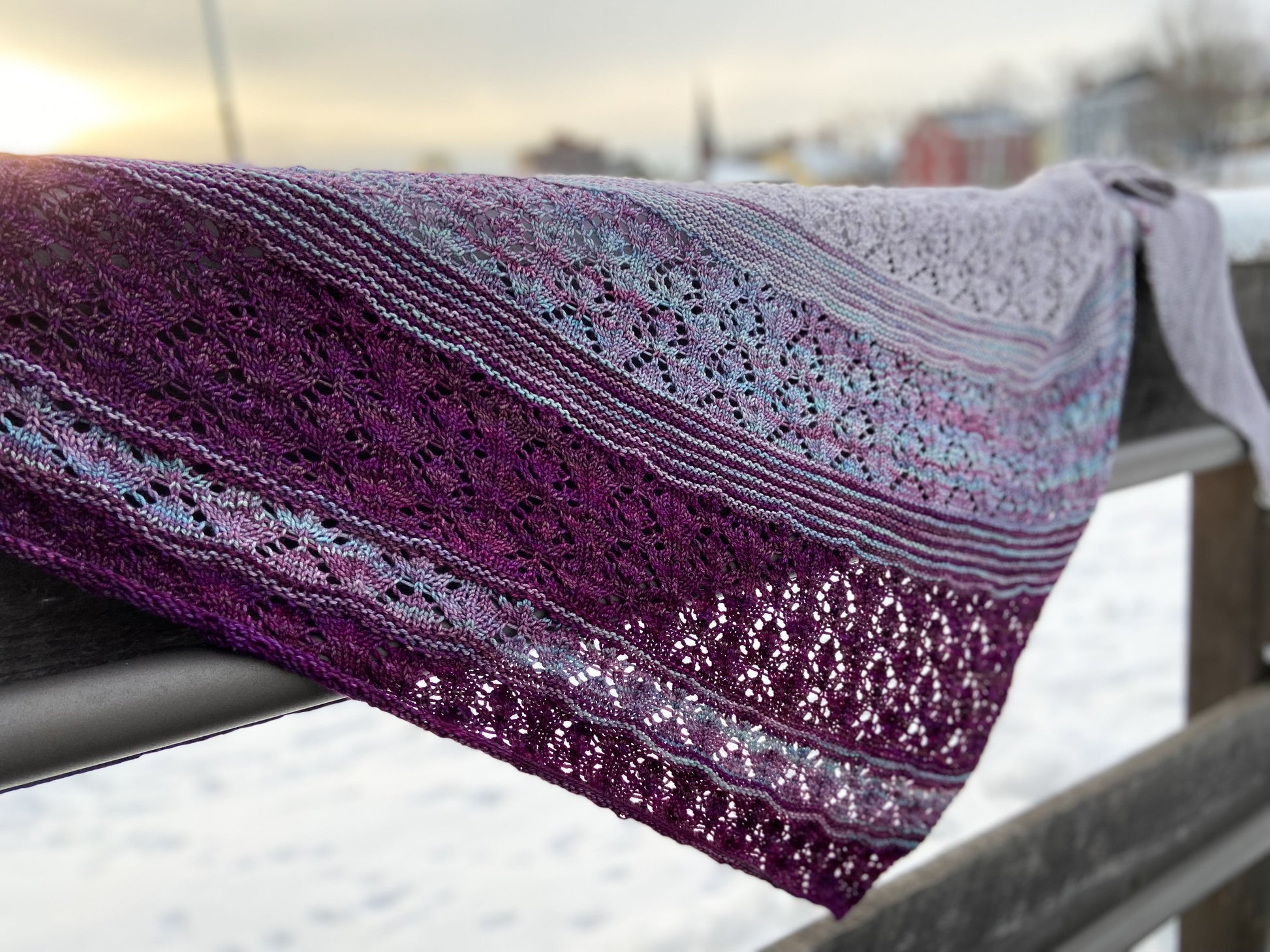 Diamond Dust is an asymmetrical triangular shawl knit on the bias with a soothing balance of meditative garter stitch and intuitive lace. Pattern is both charted and written.