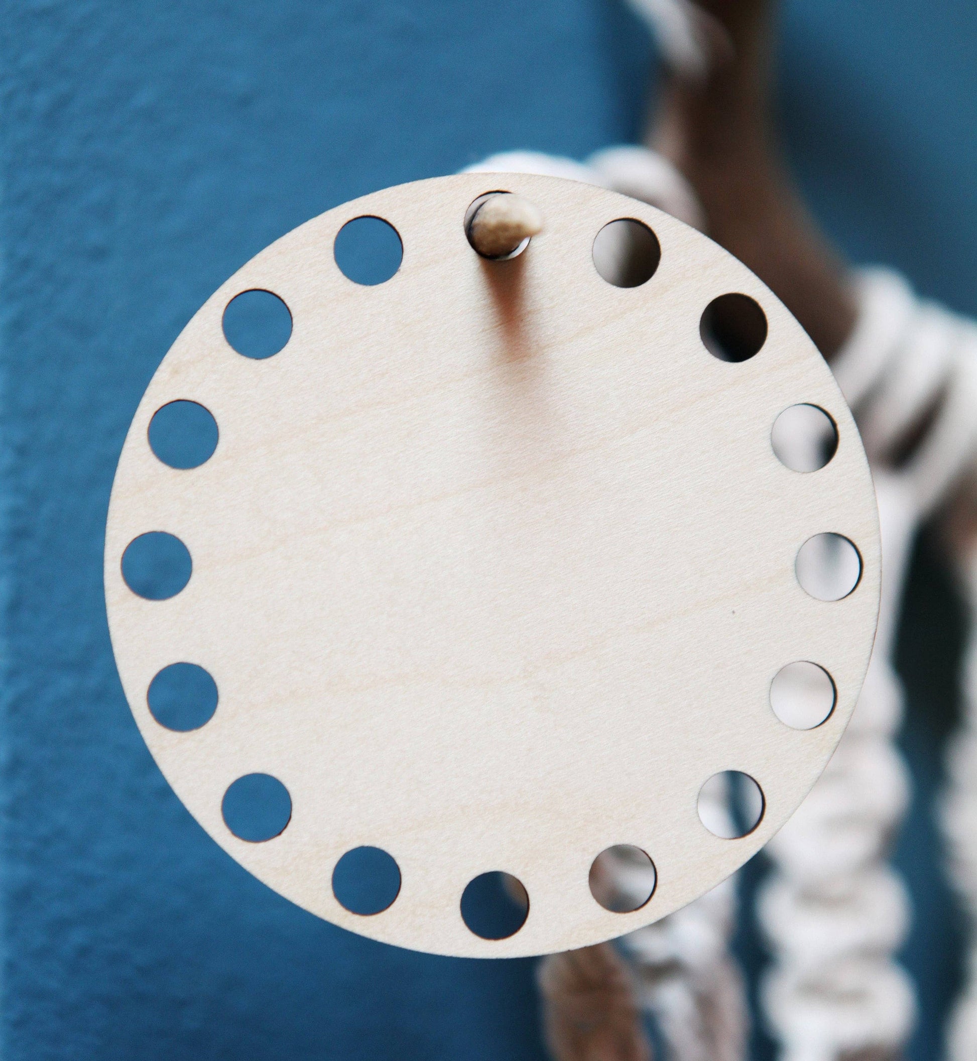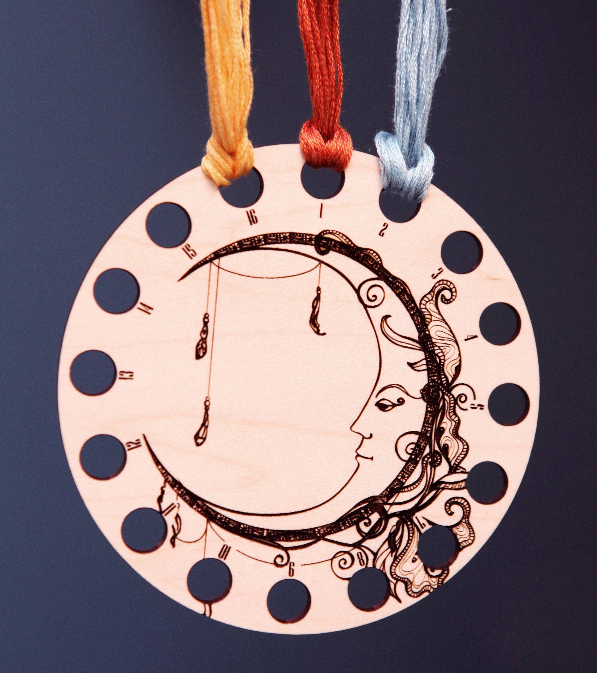 Celestial Moon embroidery floss organizer made from maple wood. This crescent boho moon needlepoint thread holder has 16 circles to keep your yarn organized.