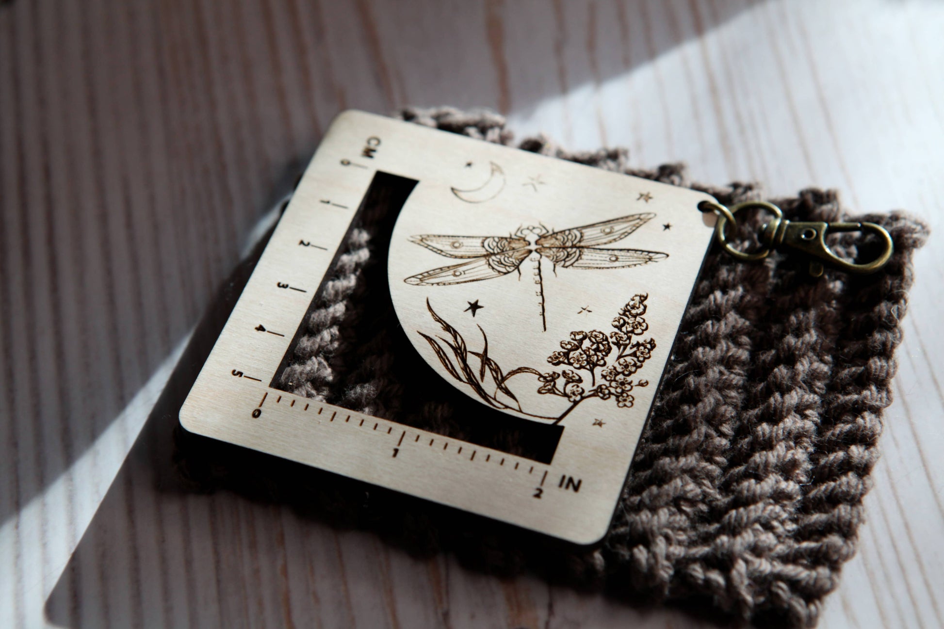 This dragonfly with crescent moon and stars gauge swatch ruler easily clips onto your knitting bag or key ring. The gauge, which measures 3x3 inches is made from maple wood and has a two-inch ruler and a five centimetre guide. This is a great tool for those who love watching dragonflies and other flying insects.