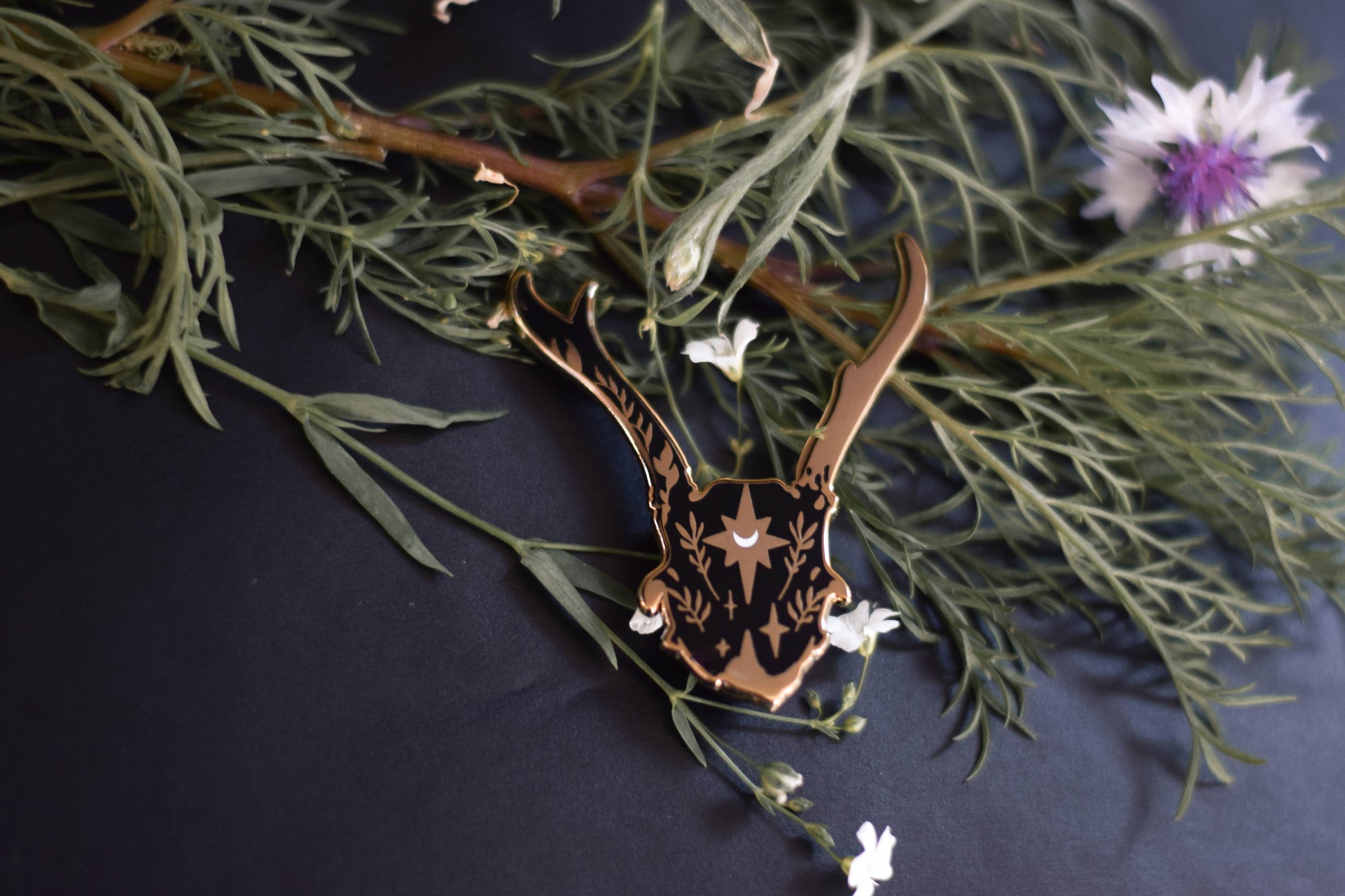 An enamel pin featuring a deer skull with natural and celestial imagery, designed by The Winter Den here in Salem!