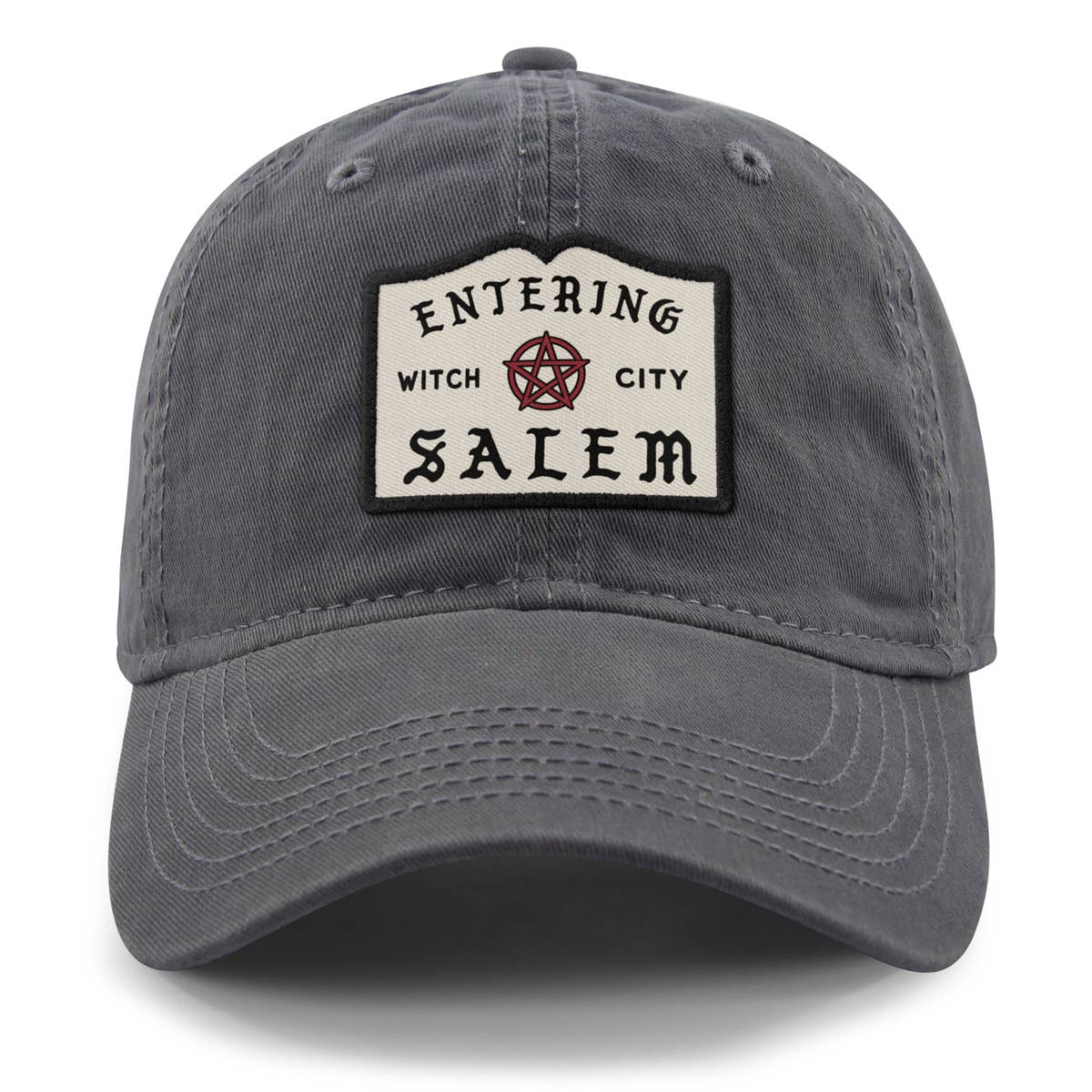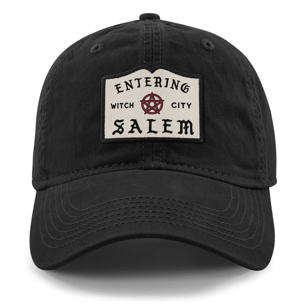 Show off your Salem love with baseball hat! This hat features an Entering Salem patch, inspired by the actual road sign leading to Salem.