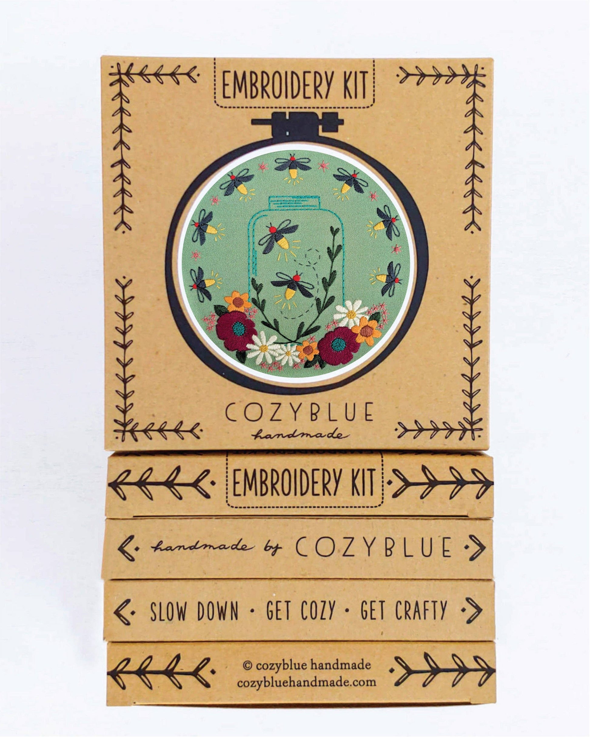 'fireflies' is inspired by the quiet magic of summer nights, and features glowing fireflies and blooming wildflowers. cozyblue embroidery kits include everything you need to create your own hand embroidered hoop. the pattern design is pre-printed on 100% cotton fabric, so there's no need for transferring or tracing. just pop the fabric in the hoop, thread your needle, and start stitching! these make easy and wonderful gifts. crafty friends, family, teachers, and co-workers will love them. or treat yourself, and have fun stitching something awesome. embroidery is a great way to slow down, get cozy, and get crafty.