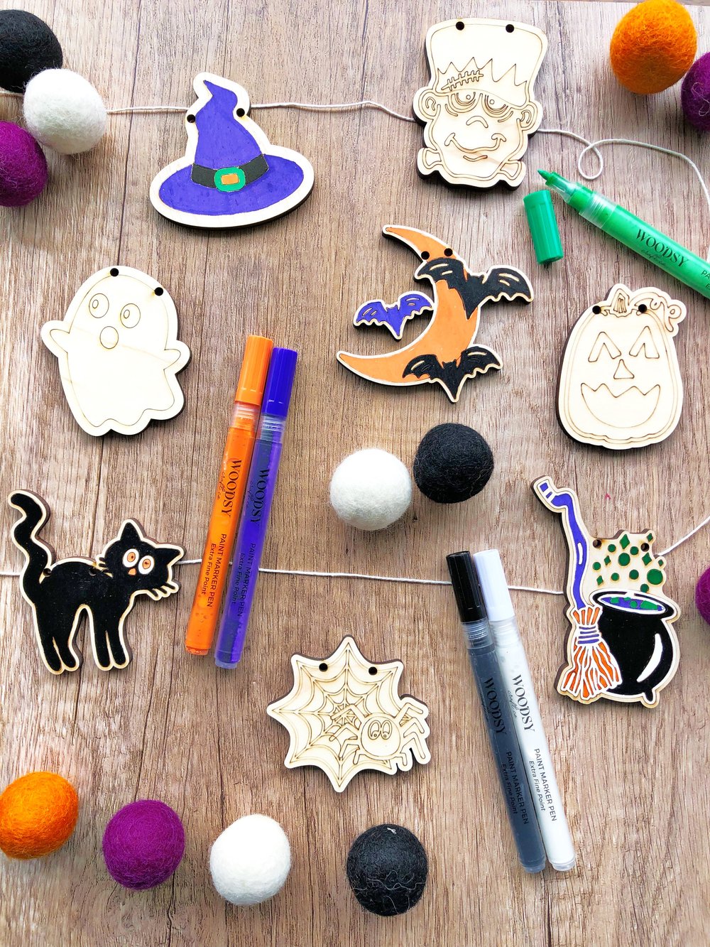 -Custom wood cutouts: Pumpkin, Spiderweb, Witch Hat, Ghost, Cat, Cauldron, Frankenstein, and Bats w/ Moon