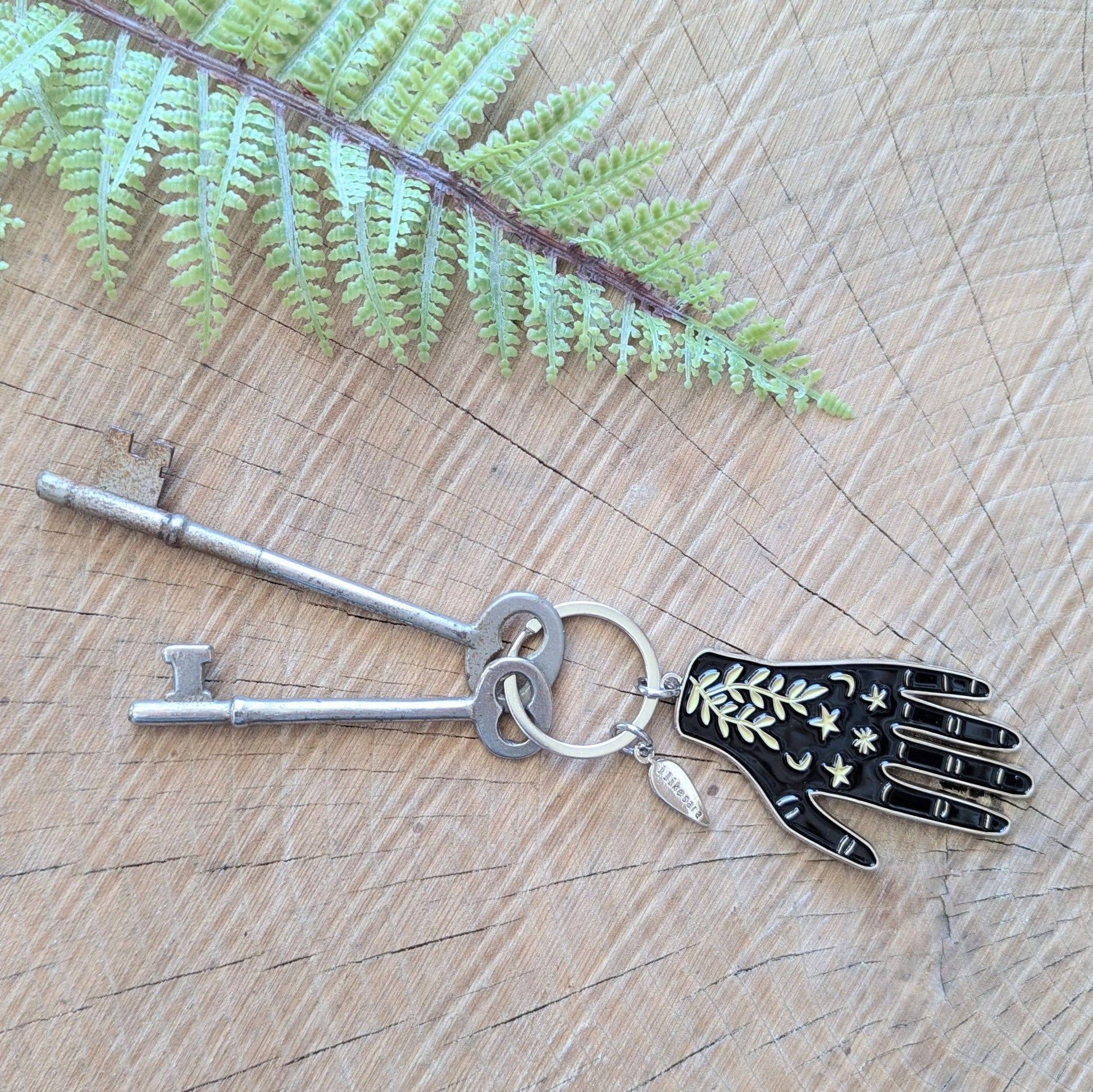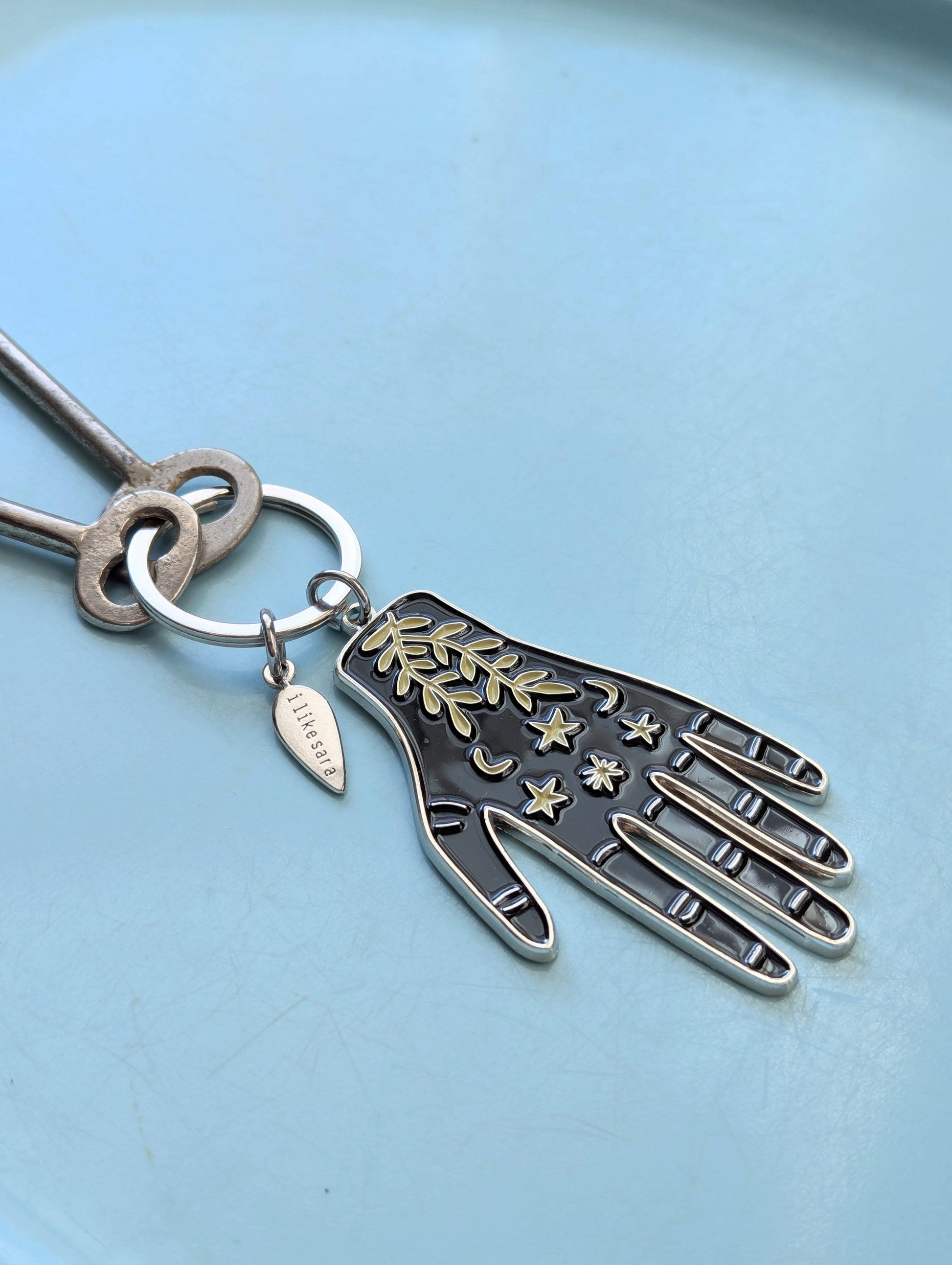 A charm to give you a hand in remembering your keys. This silver metal enamel keychain is durable and functional with a split ring for attaching to your keys and a little "ilikesara" leaf charm. This hand keychain, adorned with stars, moons, and a fern, is based on a blockprint by ilikesara / Sara Schalliol-Hodge.