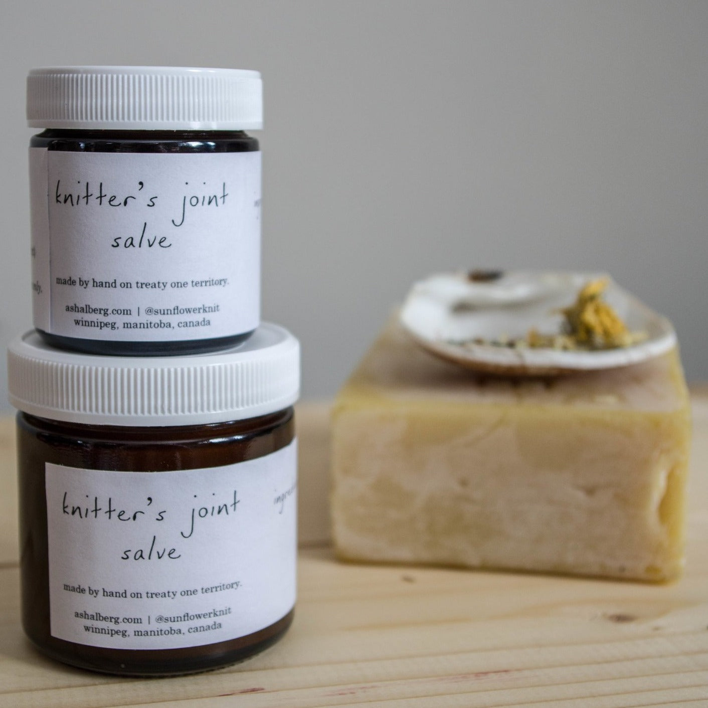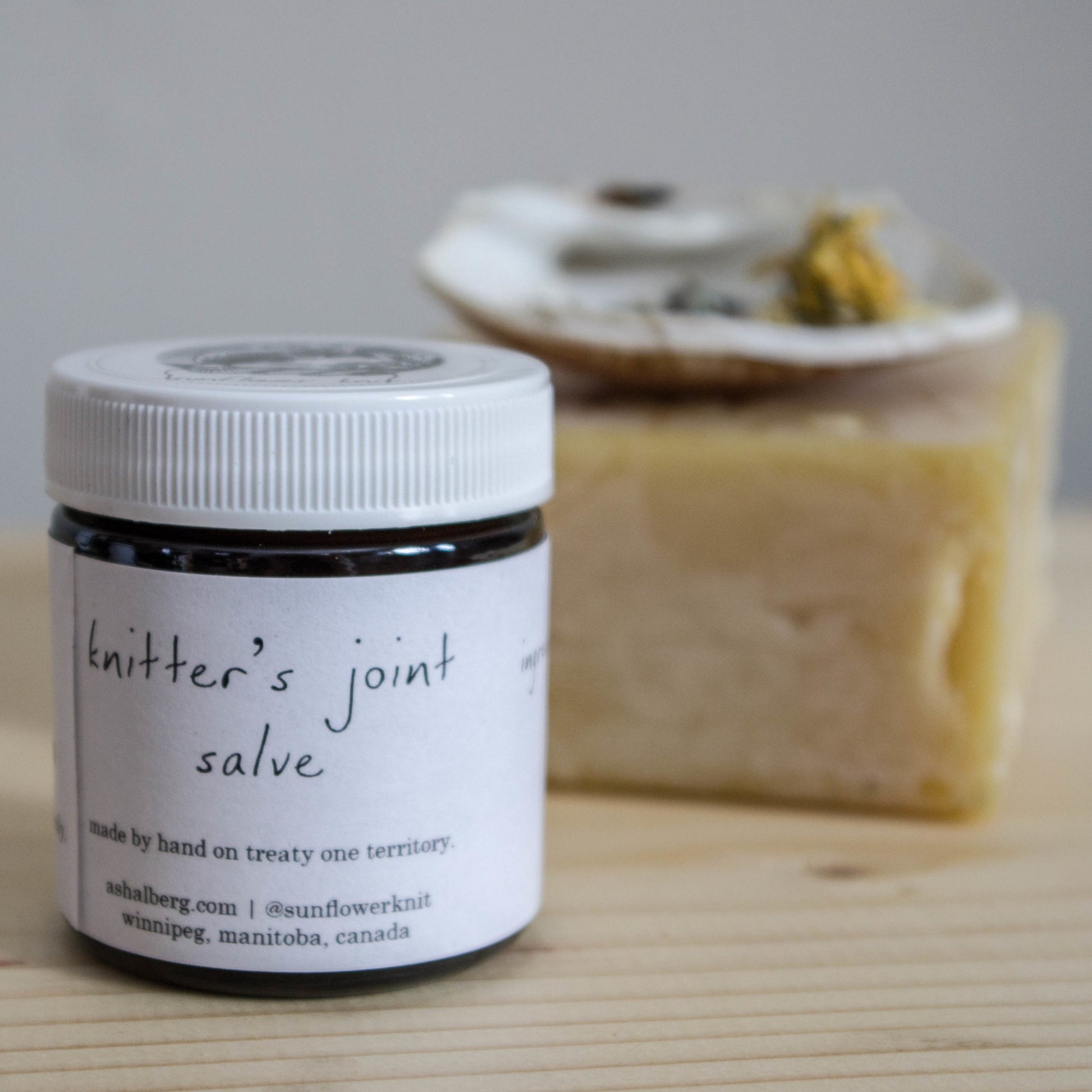 Joint relief salve handcraft by Ash Alberg aka Sunflower Knit.