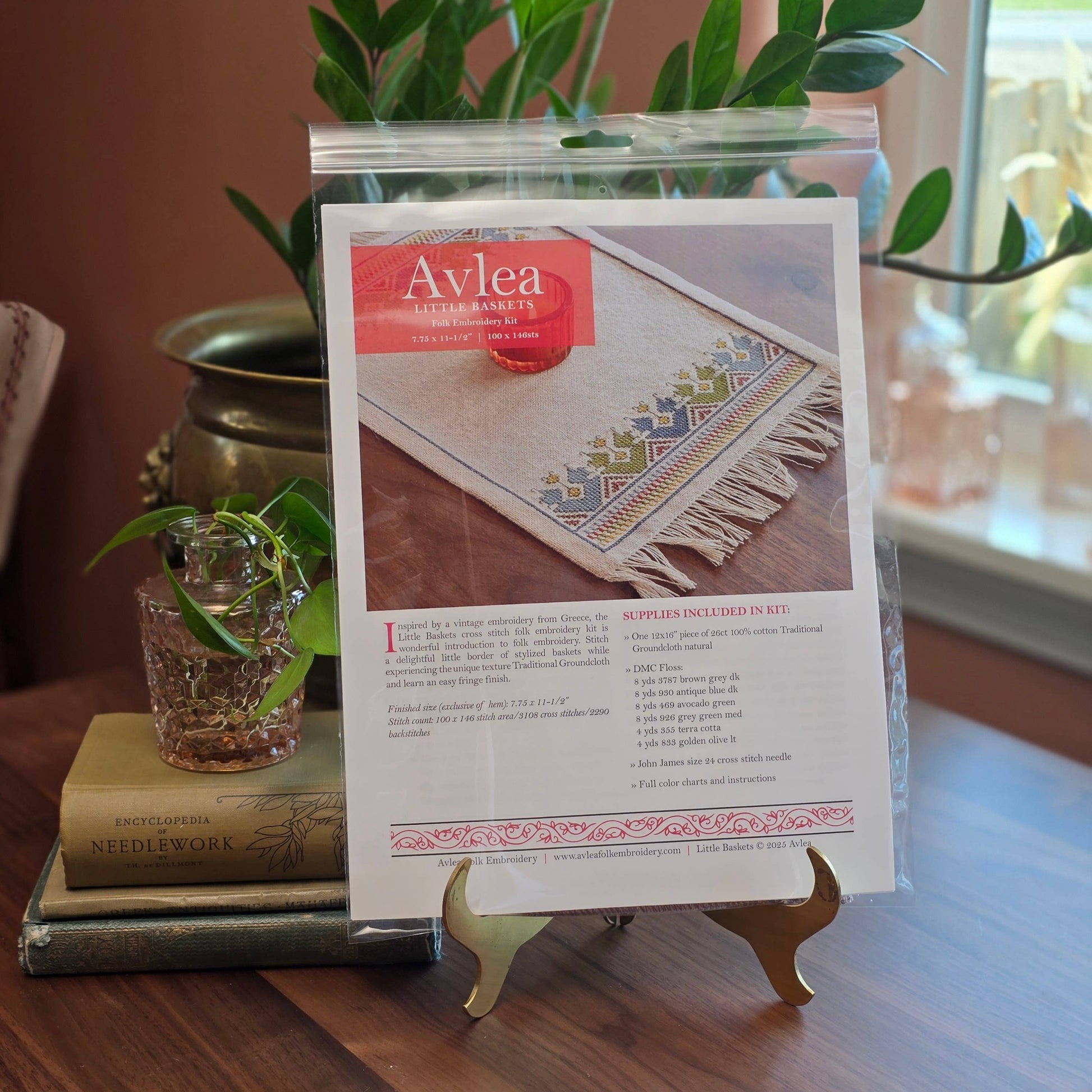 Inspired by a vintage embroidery from Greece, the Little Baskets cross stitch folk embroidery kit is wonderful introduction to folk embroidery. Stitch a delightful little border of stylized baskets while experiencing the unique texture of Traditional Groundcloth and learn an easy fringe finish.
