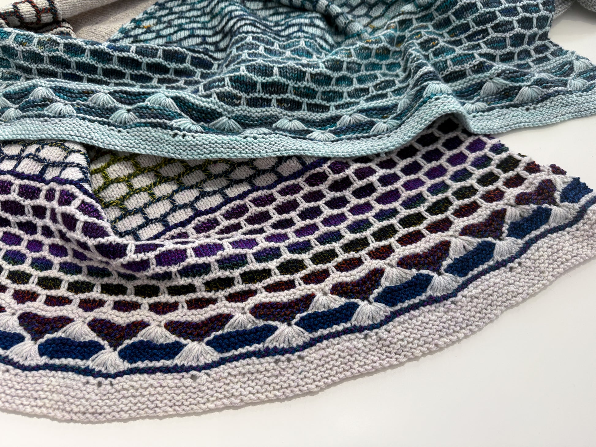 - Shawl 2: Harrisville Daylights in Lint and Spincycle Dream State in Cabinet of Curiosities (exclusive to Circle of Stitches)