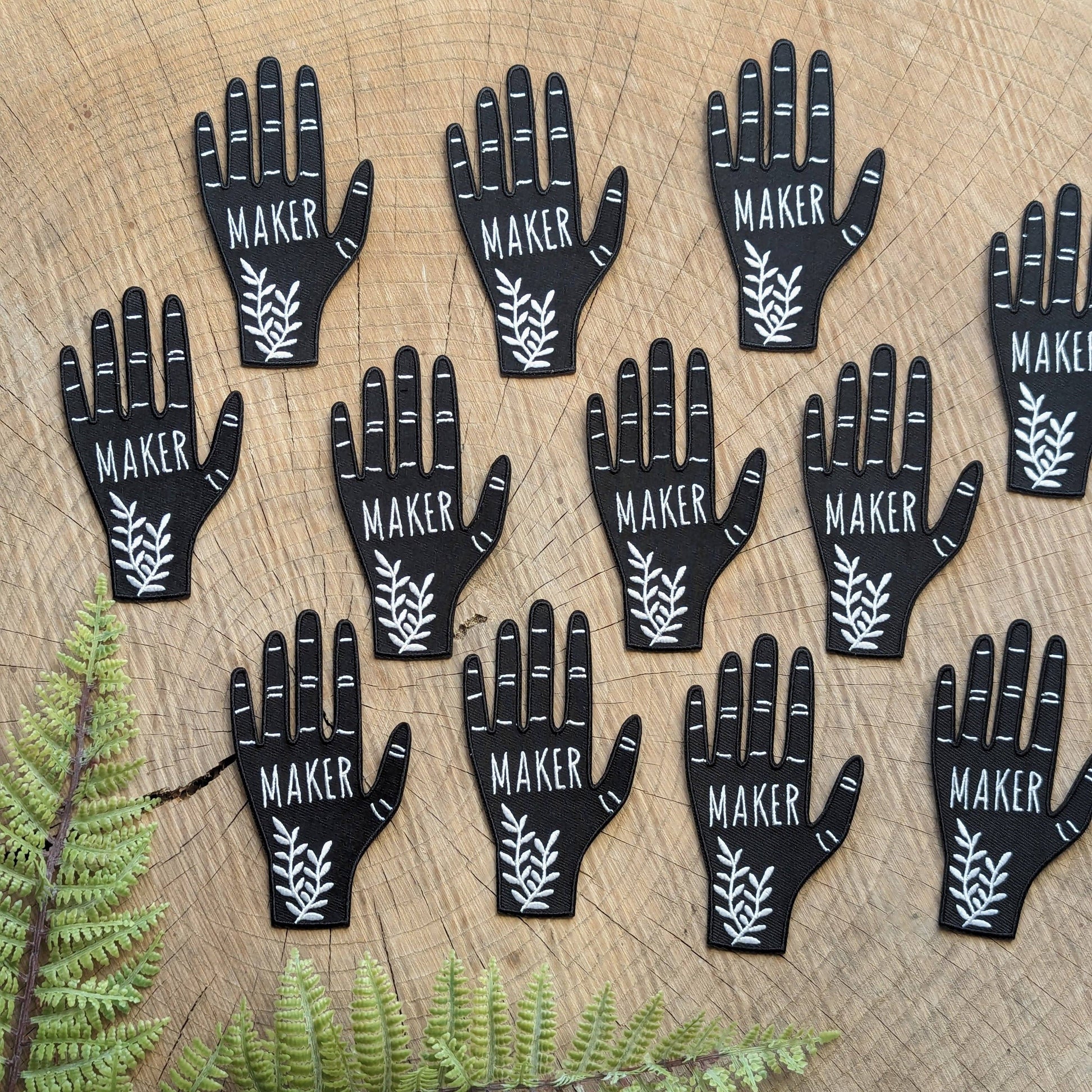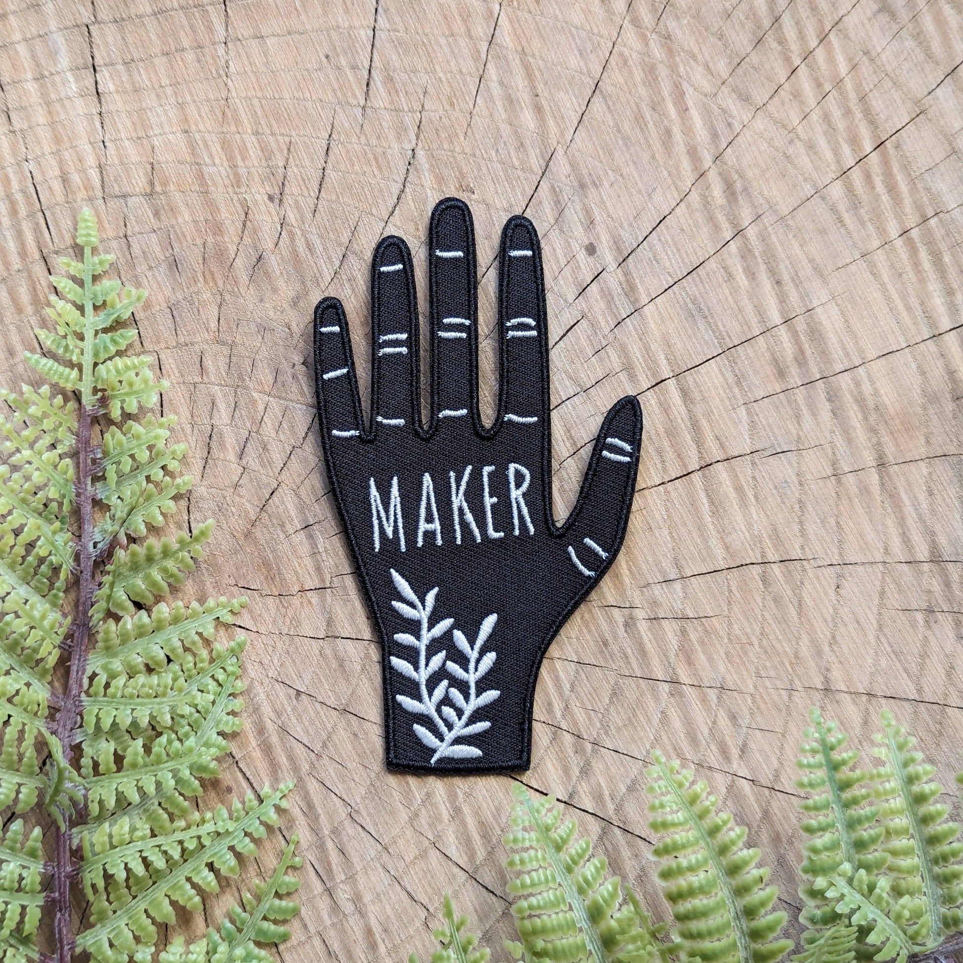 A hand-shaped patch with the word "maker" on the palm along with ferns adorning the wrist. Based on a linocut print by ilikesara / Sara Schalliol-Hodge. -black & white -2.56" x 3.9" -iron-on backing *ilikesara single patches are sold loose / packaging free in an effort to reduce unnecessary waste.* instructions for ironing: Place the patch on your garment and cover the patch with a piece of fabric. Iron on high heat for 30-45 seconds. Turn the garment inside-out and iron on reverse side of the patch for 30-45 seconds.