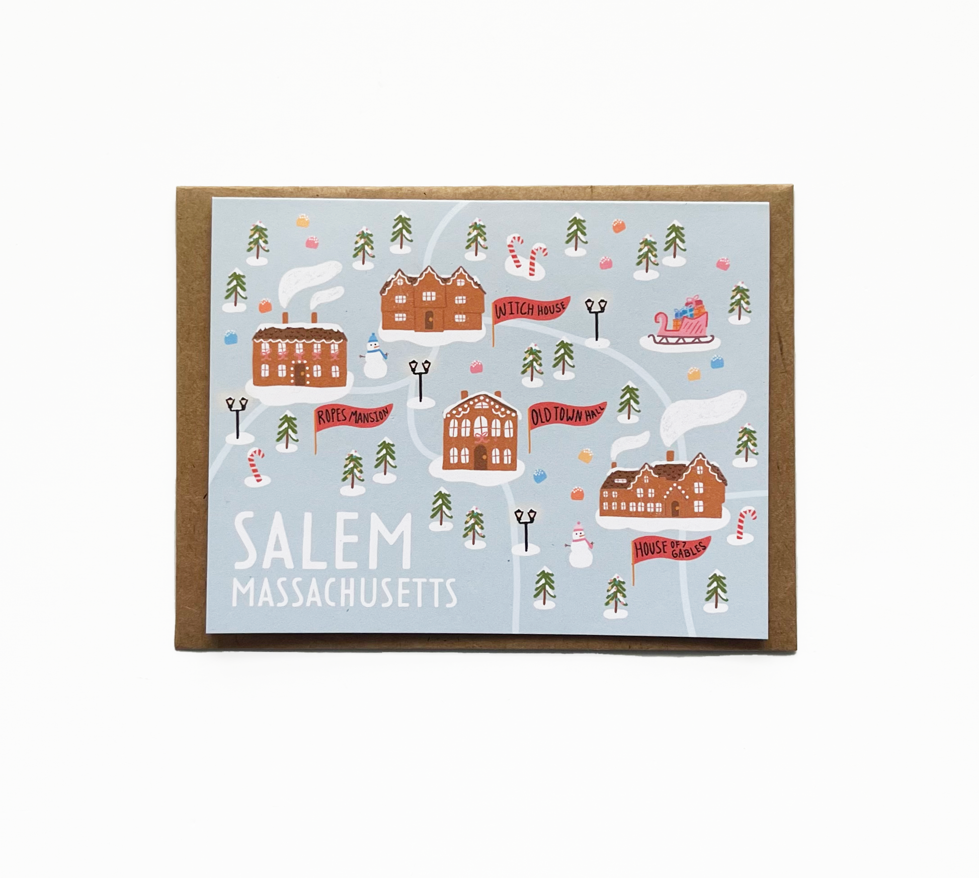 A holiday card featuring a snowy illustrated map of Salem, MA by local artist Keegsie.