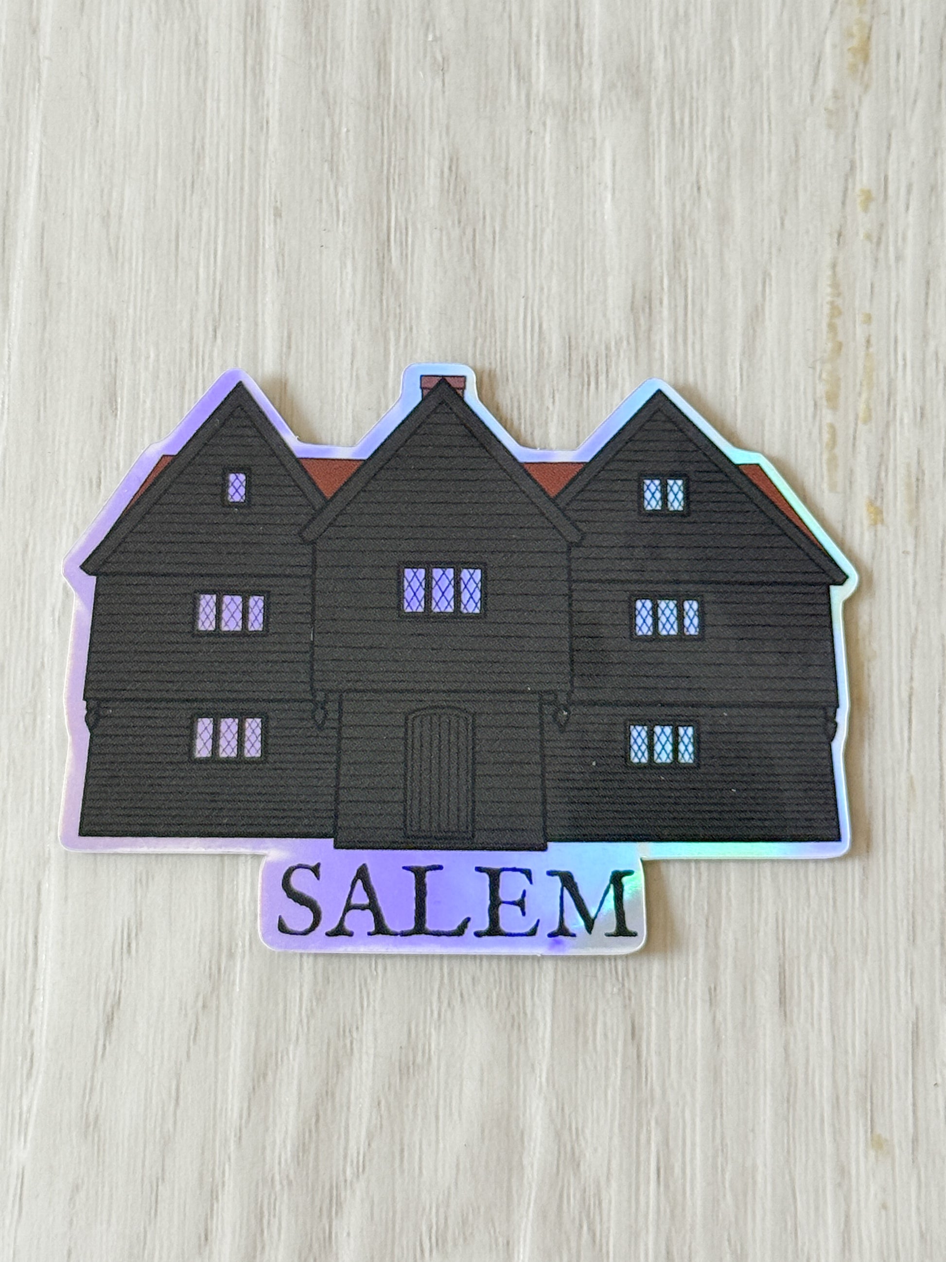 A holographic sticker featuring the Witch House in Salem, MA. The Witch House is one of the few ties to the Salem Witch Trials still standing in Salem! The house was owned by Judge Johnathan Corwin. It is now operated as a museum to the Witch Trials and is visited by witches traveling from far and wide. We love this reclaiming of a space associated with the persecution of witches to one that is now reclaimed by witches living in and visiting Salem. This is an exclusive design to Circle of Stitches featuring hand-drawn original artwork by shop owner Ana Campos. It's a perfect little piece of Salem, Massachusetts to bring home with you!