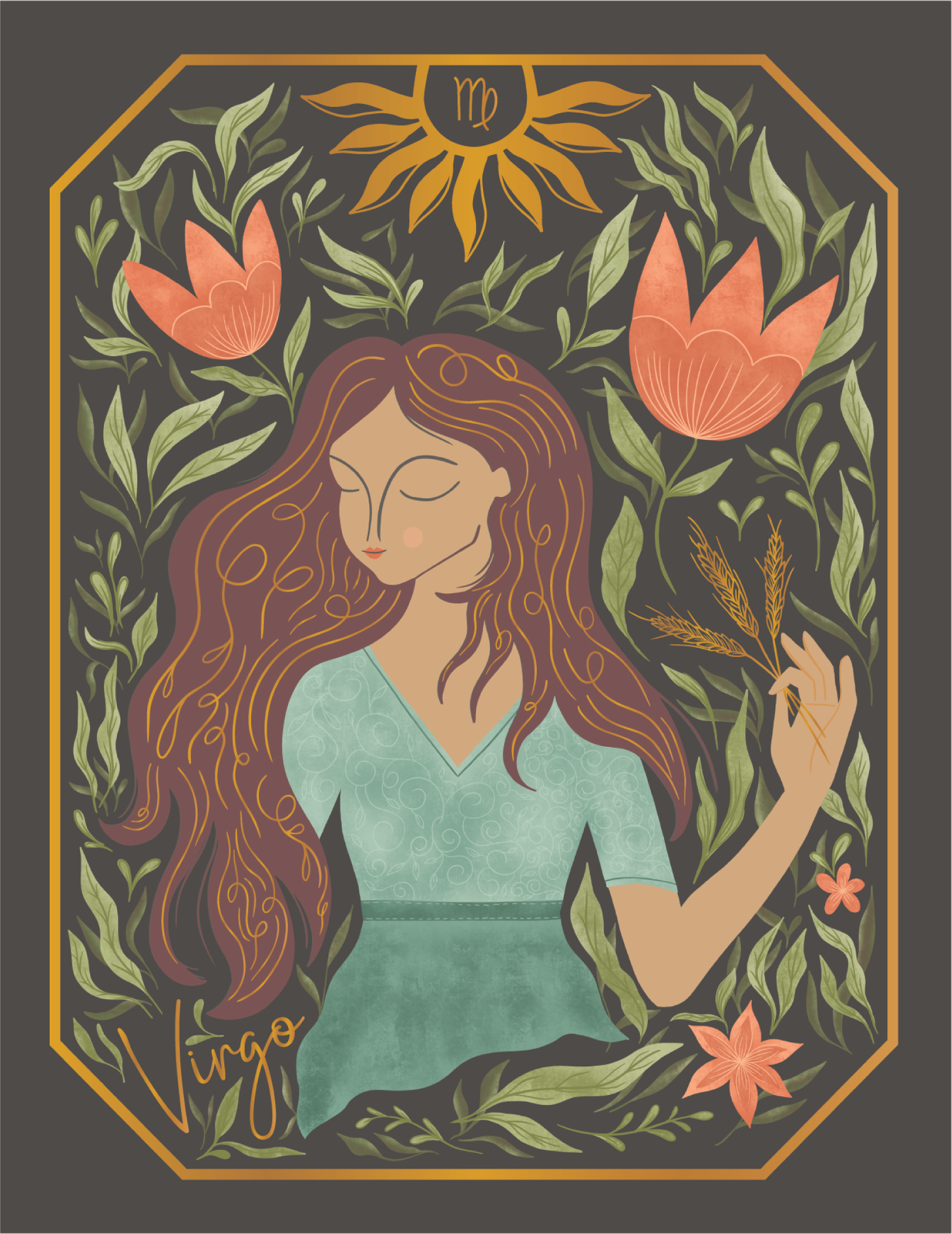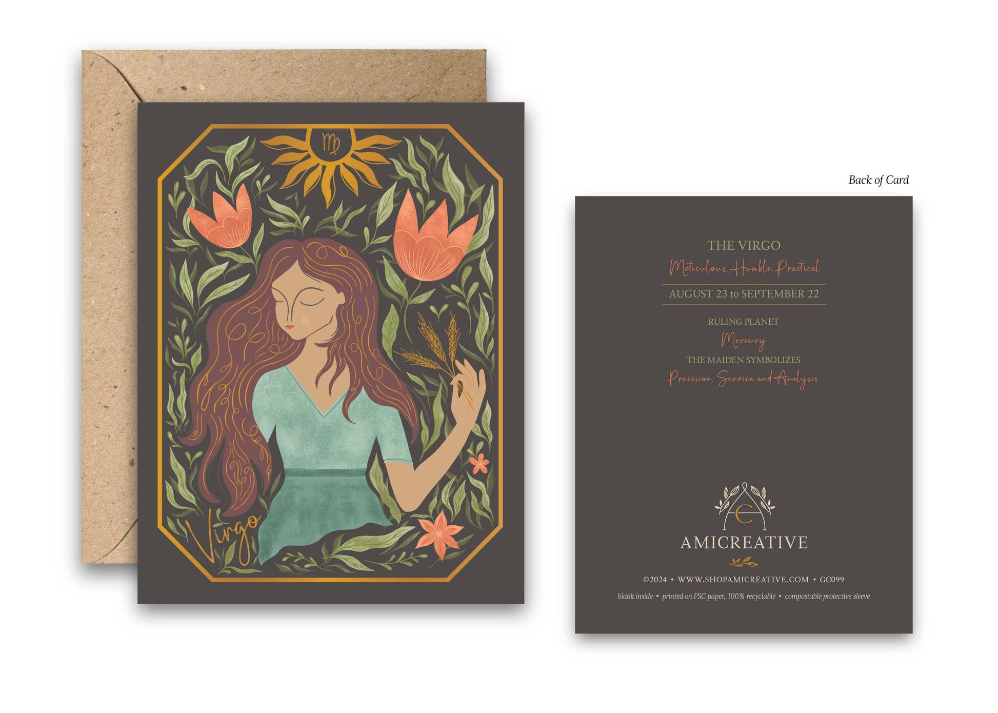 This design captures the essence of Virgo’s meticulous and caring nature, making it perfect for Virgo birthdays or sending a well-thought-out note. Informative details about Virgo’s traits and dates on the back enhance the value and appeal of each card.
