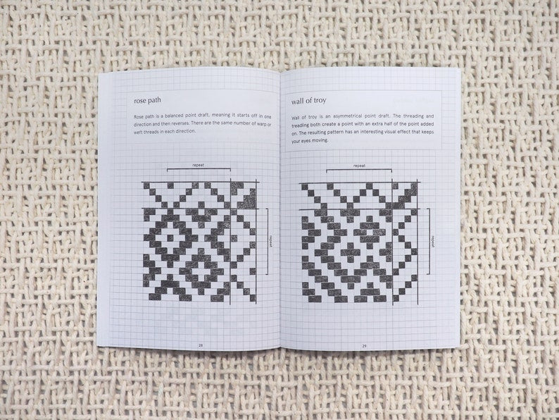 A beginners guide to the basics of floor loom weaving. This introduction covers recommended tools, creating a warp, loom set up, how to read a pattern draft, weaving tips, finishing techniques, resources and more. All information is tailored to jack floor looms and uses U.S. customary units and information. Illustrations are included throughout to guide through the process. A selection of 4-harness pattern drafts are featured, including plain weave, basketweave, balanced twill, unbalanced twill, broken twill, rose path, wall of troy, waffle weave, log cabin and stairsteps. Further ideas can be recorded under the project planning section.