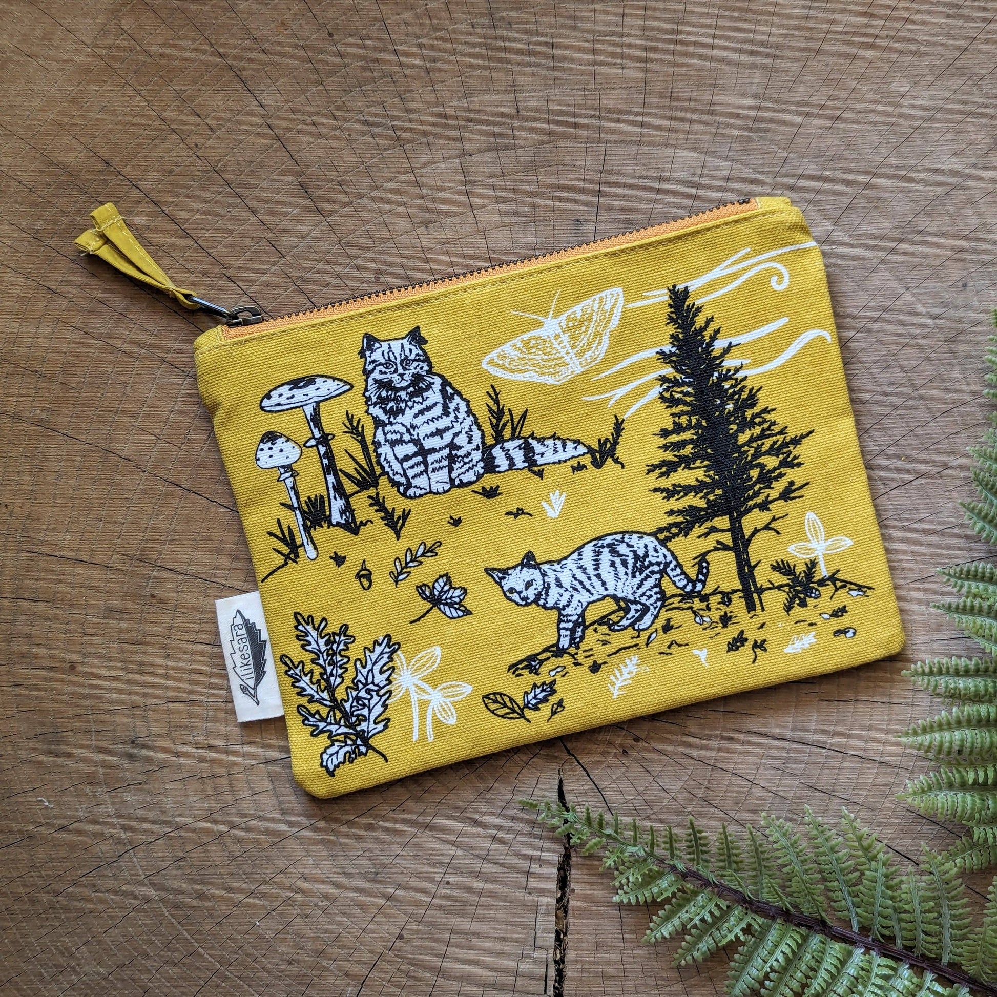 Take some feline friends everywhere you go (especially outside!) with this canvas cat zippered pouch. Featuring cats and outdoor scene illustrations by ilikesara (aka Sara Schalliol-Hodge), this handy zippered pouch will keep you organized. This zippered bag is double sided, so you get two different sets of two kitties on each side!